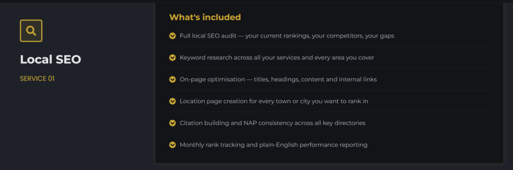 Their work falls into three core areas that every website needs to perform well in search. On-page SEO means optimising your page titles, headings, meta descriptions, and content for the right search terms. Off-page SEO focuses on earning quality backlinks that build your website’s authority in Google’s eyes.